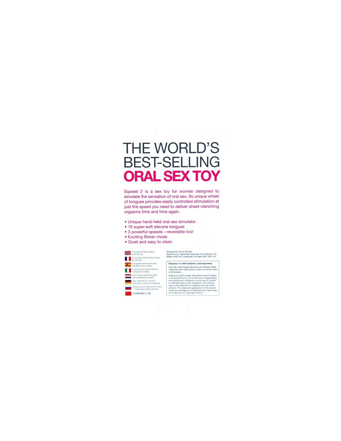 Sqweel 2 heeft een wiel met 10 silicone overlappende tongen, is omkeerbaar met 3 snelheden, heeft een spannende nieuwe flicker-modus en heeft 30% meer vermogen dan de originele Sqweel! Probeer nu dit speeltje!